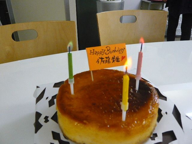 「先生 おめでとうございます〜」と奥さんの手作りチーズケーキを